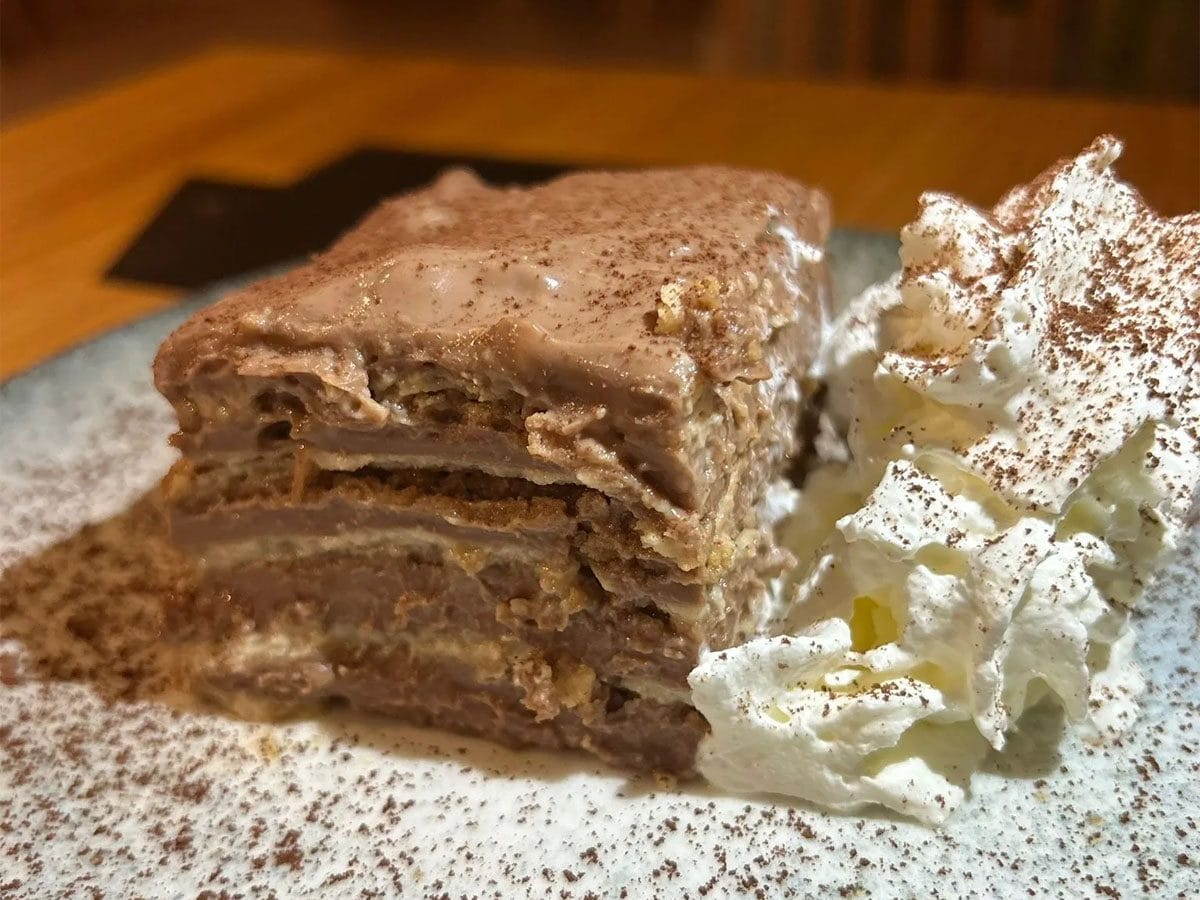 Ook hier staat een huiselijke klassieker centraal: een heerlijke koekjes- en custardcake, laag voor laag opgebouwd met in melk gedoopte koekjes, zachte custard en intense chocolade. Een dessert dat smaakt naar thuis. Hun speciale tip: combineer warme chocolademelk met een scheutje rode wijn voor een verrassende en rijke smaakervaring.